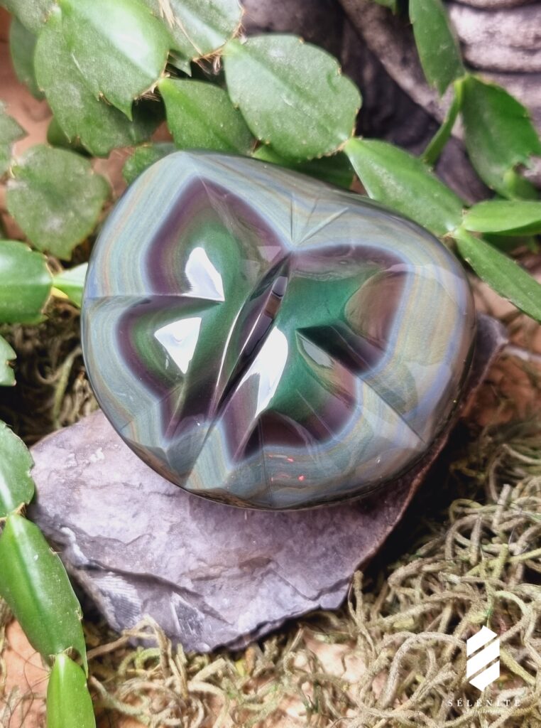 Et en ce qui concerne notre obsidienne oeil céleste ? Les impuretés seront causées elles aussi de magnétite, d’hématite… et de feldspath. Quant à ses superbes couleurs, elles sont le résultat d’un phénomène appelé “coloration structurelle”: contrairement aux pigments qui absorbent et réfléchissent des longueurs d’ondes spécifiques de la lumière, les couleurs structurelles, elles, résultent de l’interaction de la lumière avec la microstructure d’un matériau.